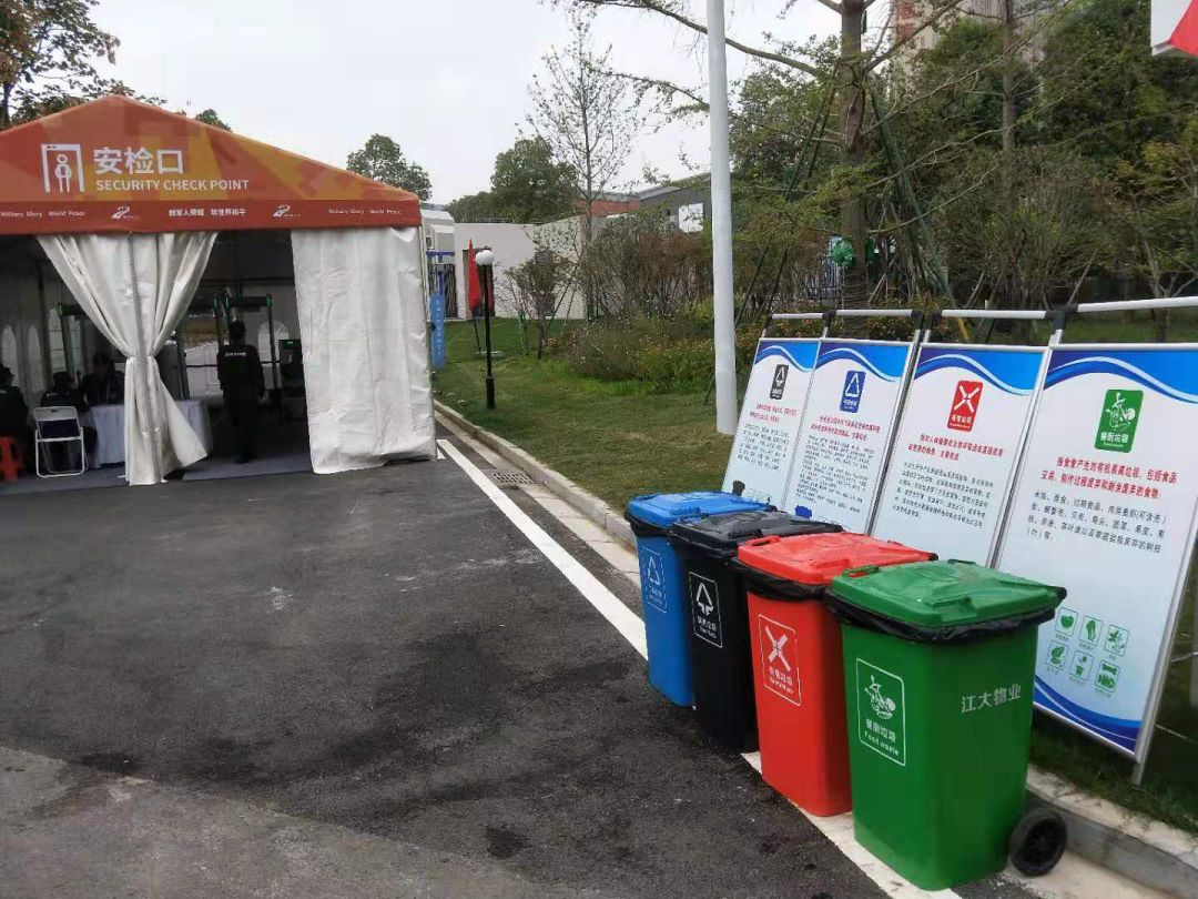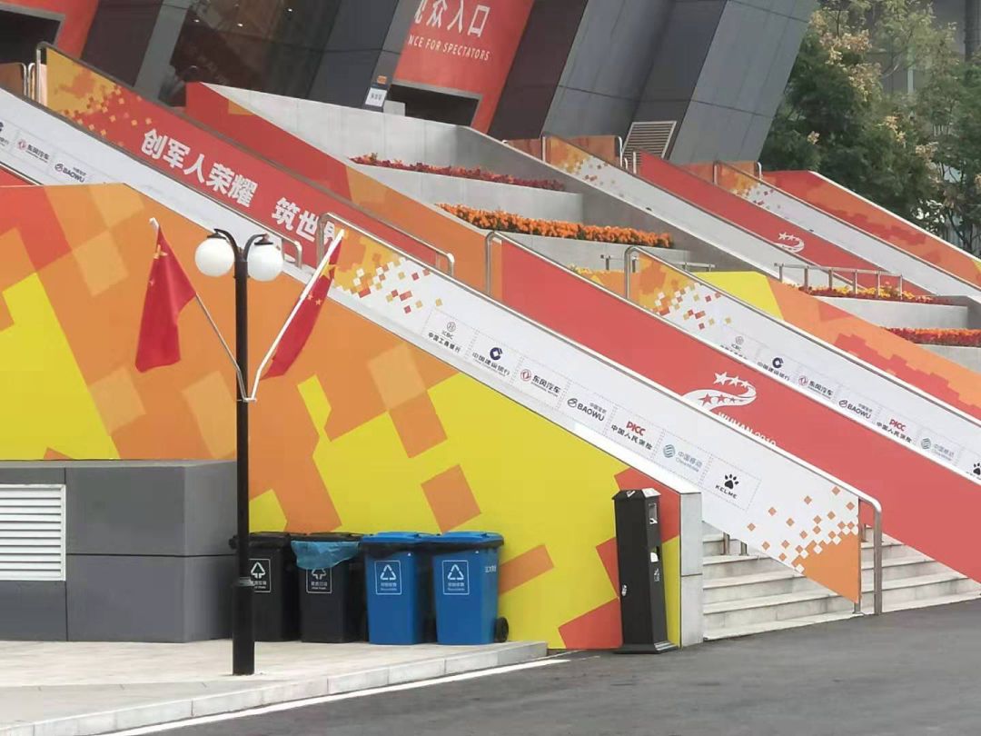1、在体育馆内外共配置220个分类垃圾桶,并按要求设置四类垃圾桶的摆放,生活垃圾做到“日产日清”。