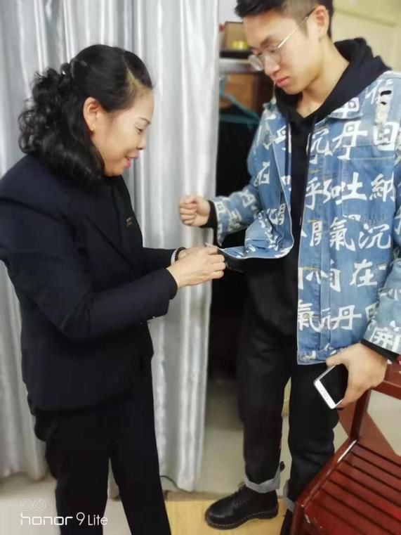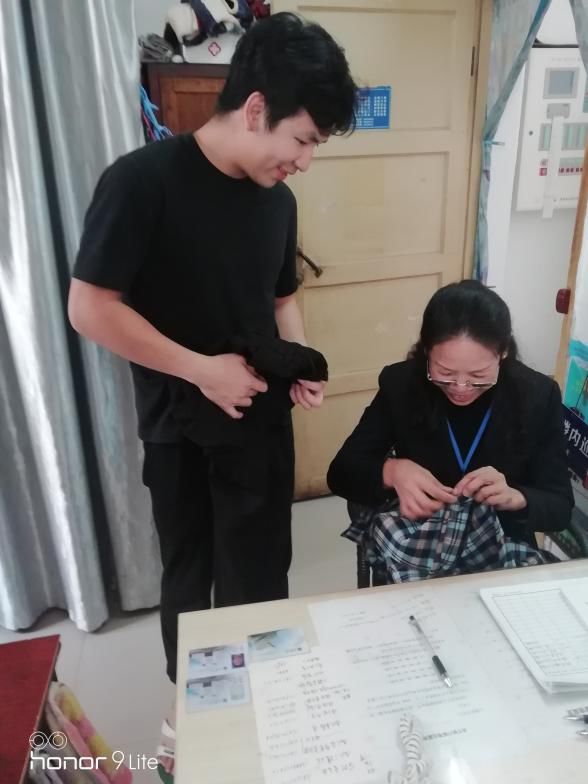 最开始是给417寝室的李庆航同学缝补演出服,因同学的演出服是租来的,扣子掉了穿着不合身,又要赶着演出,时间紧迫,同学抱着试试的心态问何师傅可不可以帮忙缝一下扣子,为了不耽误同学演出,何师傅晚饭都没吃就给同学把衣服缝好了,不忘叮嘱他们要好好表现,拿奖回来就是最大的回报。李同学演出完后,其它同学问他衣服怎么这么合适,李庆航同学非常得意地说是遇见贵人了,在同学们的询问之下,李庆航同学说是我们的何阿姨缝补的,以后扣子掉了,裤子脱线了就找阿姨缝补,为此还封阿姨是“巧手妈妈”,自从得知阿姨会缝补后,基本上每天都有同学找阿姨不是扣子掉了就是裤子脱线了,阿姨也是毫无怨言的给他们做自己力所能及的事情,她在同学口中不是阿姨,而是妈妈。